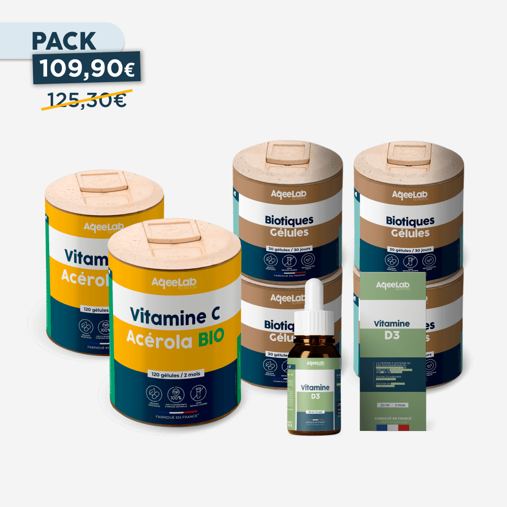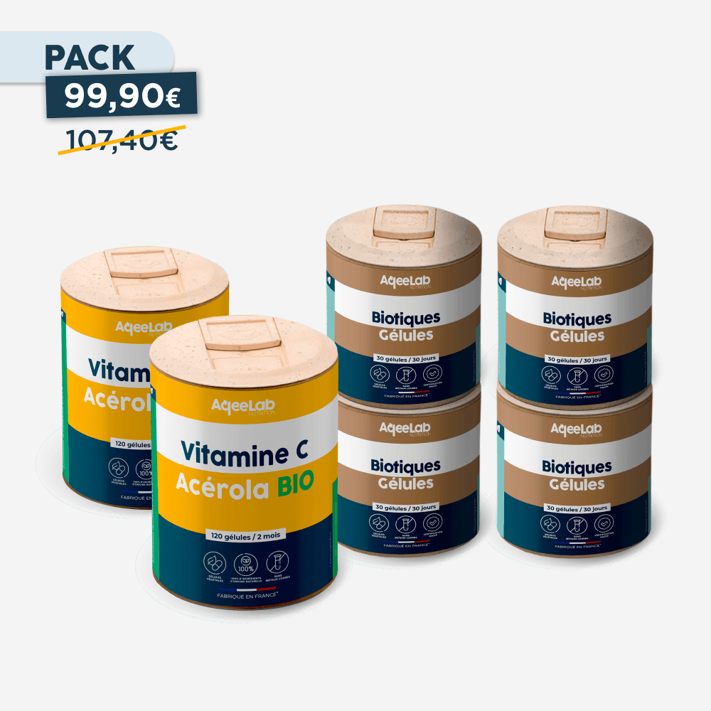 Le Pack Immunité d’Aqeelab, conçu pour soutenir votre système immunitaire tout au long de l’année. Disponible en deux versions – Hiver avec vitamine D et Été sans – ce pack associe les bienfaits puissants de la vitamine C Acérola Bio et des probiotiques. La vitamine C naturelle, issue de l’Acérola, offre une biodisponibilité supérieure avec 146 mg par dose, renforçant votre défense immunitaire.